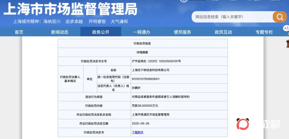 10月14日,界面新闻从上海市市场监督管理局网站获悉,“世纪佳缘”关联公司上海花千树信息科技有限公司因虚假宣传,被上海市杨浦区市场监督管理局处以28万元罚款。