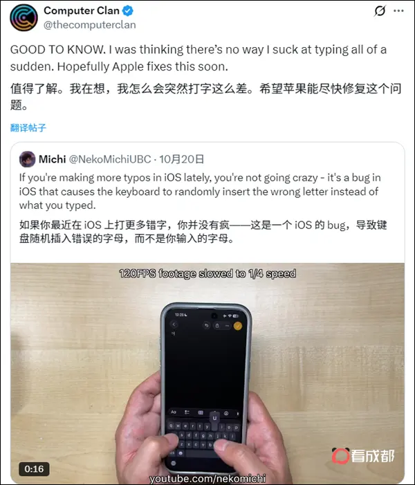 有人回复称,这是iOS的一个Bug,会导致键盘随机插入错误的字母,而非你输入的内容。他分享的慢动作视频清楚显示,键盘确实有时无法识别正确的输入。