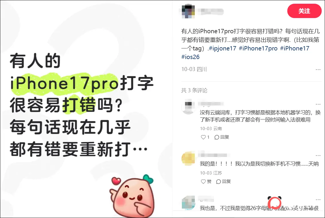 还有人在更新到iOS 26后抱怨输入问题,表示自己突然出现“愚蠢的打字错误”,并注意到空格键有时会失灵,整体感觉打字精度下降。另一位用户也提到,升级到iOS 26后,尤其是在输入长消息时,键盘感觉卡顿或迟钝。