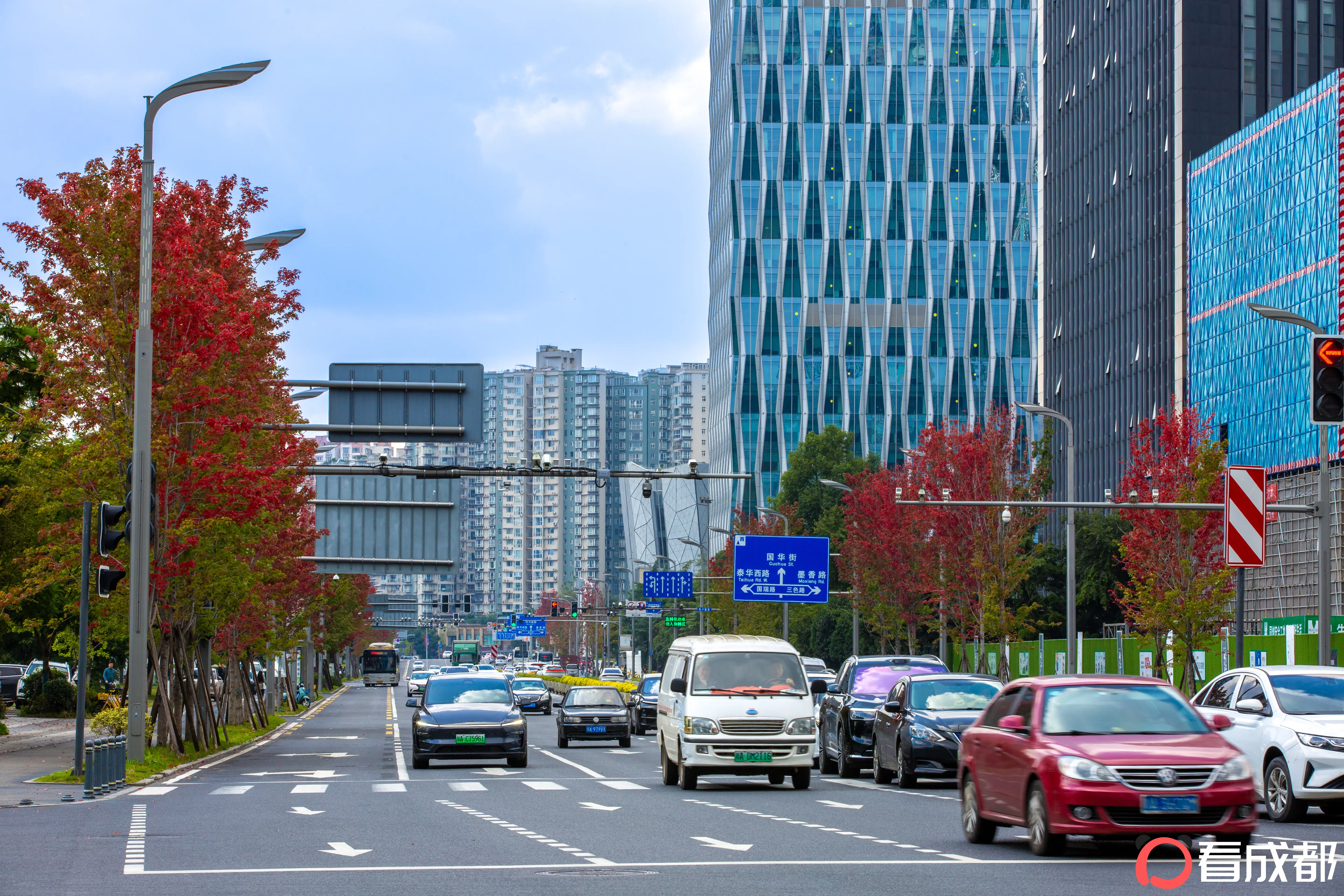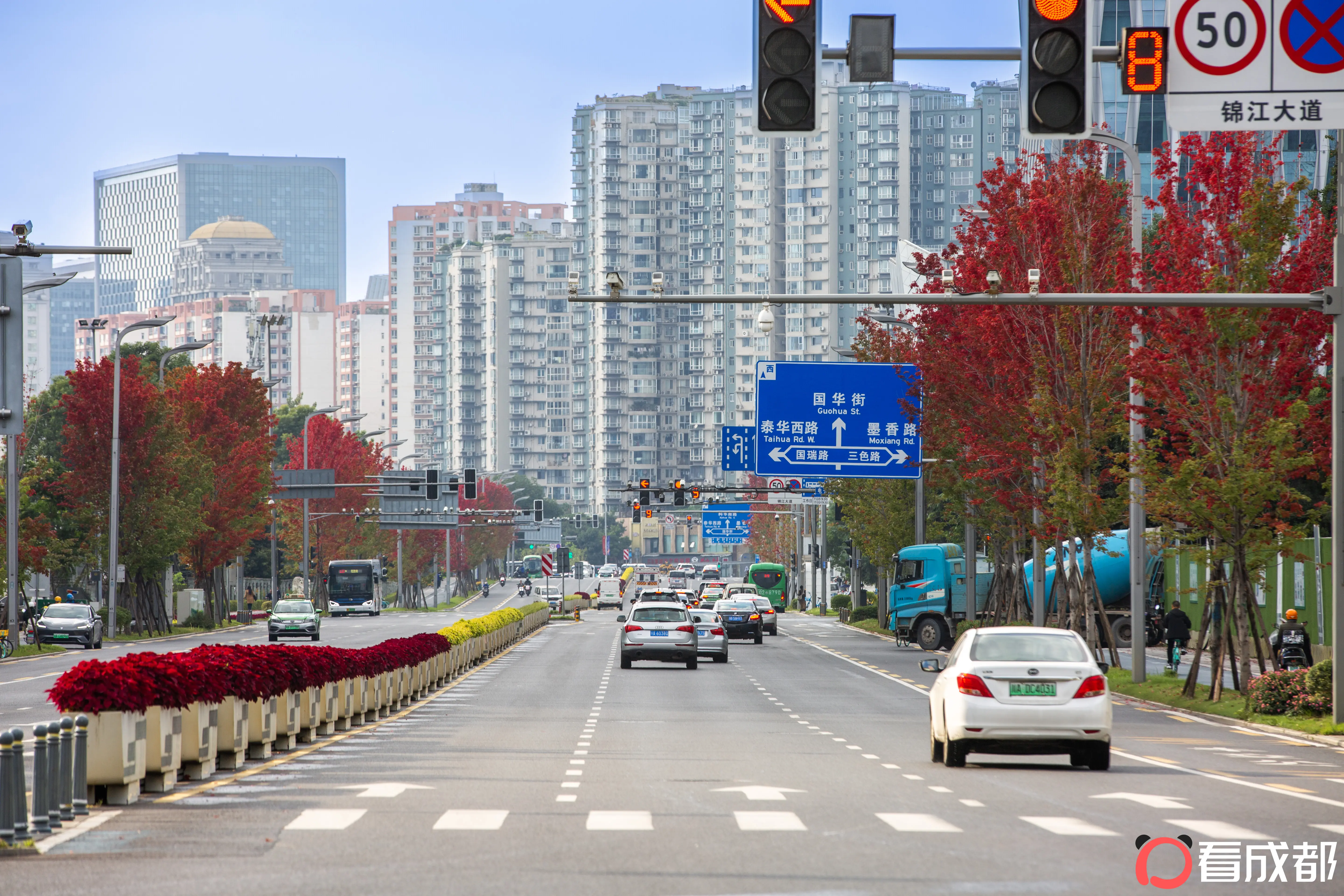 秋风送爽,成都锦江大道的行道树悄然换装。继夏日蓝花楹铺就的蓝紫色浪漫长廊后,秋日红叶现已悄然登场,为城市主干道添上浓墨重彩的秋意。
