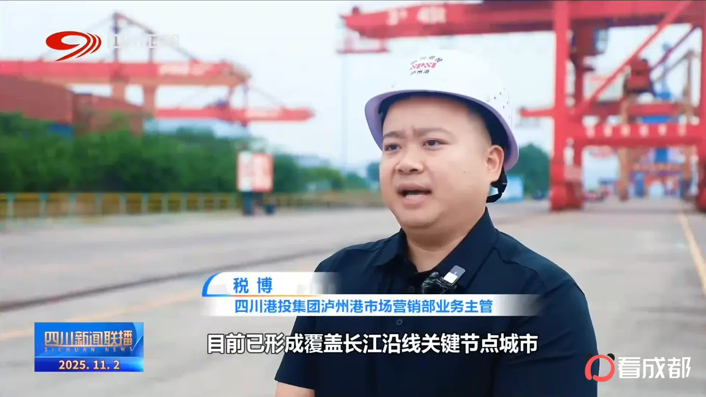 四川港投集团泸州港市场营销部业务主管 税博:泸州港综合吞吐(箱)量将从(“十三五”末)17.21万标箱增至(2025年底)26.5万标箱。目前已形成覆盖长江沿线关键节点城市、辐射川滇黔渝地区的9条国内精品航线。2024年又开通西部陆海新通道江铁海联运班列、中越(中老)国际班列,让四川货物更加便捷地走进欧亚、东南亚市场。
