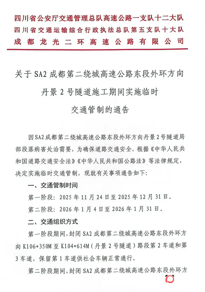11月24日起,成都二绕通行有变 转载 11月18日 看成都 来源:成都发布 4744阅读 看成都 看成都官方账号 关注 已关注 私信 司机朋友们注意!2025年11月24日至2025年12月31日、2026年1月4日至2026年1月31日成都第二绕城高速部分路段通行有变,具体如下: