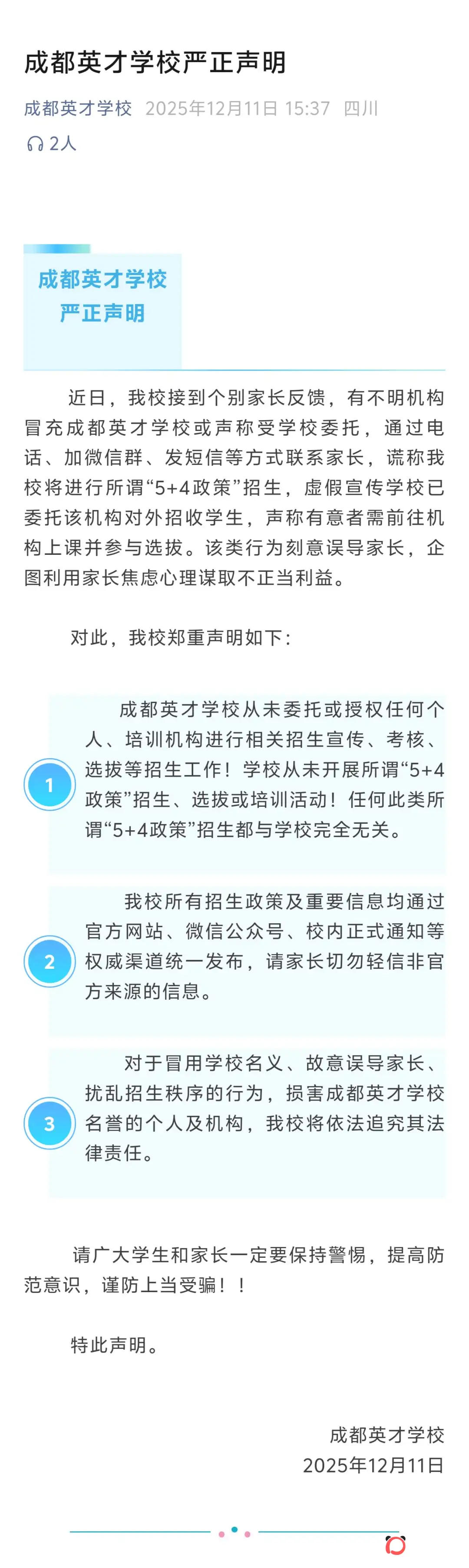 近日,成都英才学校接到个别家长反馈,有不明机构冒充成都英才学校或声称受学校委托,通过电话、加微信群、发短信等方式联系家长,谎称学校将进行所谓“5+4政策”招生,虚假宣传学校已委托该机构对外招收学生,声称有意者需前往机构上课并参与选拔。该类行为刻意误导家长,企图利用家长焦虑心理谋取不正当利益。对此,成都英才学校发布声明如下: