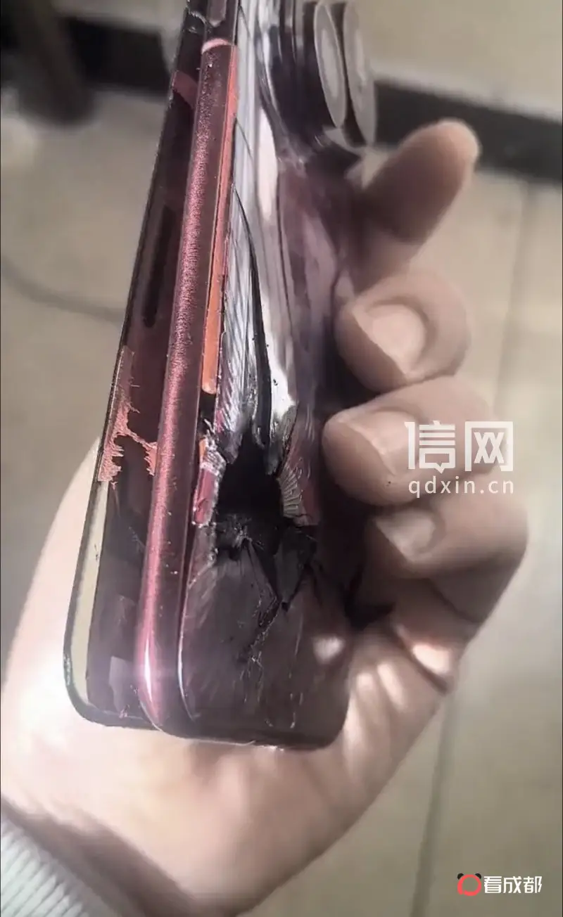 郑先生回忆说,12月10日中午,自己在卧室电脑桌前玩游戏,一旁的华为Pura 80 Pro+手机连接原装充电器在正常充电。“手机就在桌子上,离我不到一米远,突然‘砰’的一声,我扭头一看,手机已经在地面上着火了。”郑先生向信号新闻描述当时的画面——“机身冒出黑烟,火星喷出,黑色粉末溅落一地,满屋都是焦糊的味道……”他赶忙拔下充电线,熄火后手机已经面目全非,原本光滑的铝硅玻璃后盖大块翘起,布满蛛网般裂纹,边缘还有焦黑色的灼烧痕迹,机身已经扭曲变形。郑先生说,卧室里的刺鼻气味三天后还能闻到,即使开窗通风,效果也不大。“幸好当时我在旁边,否则手机突然起火,后果不堪设想!”
