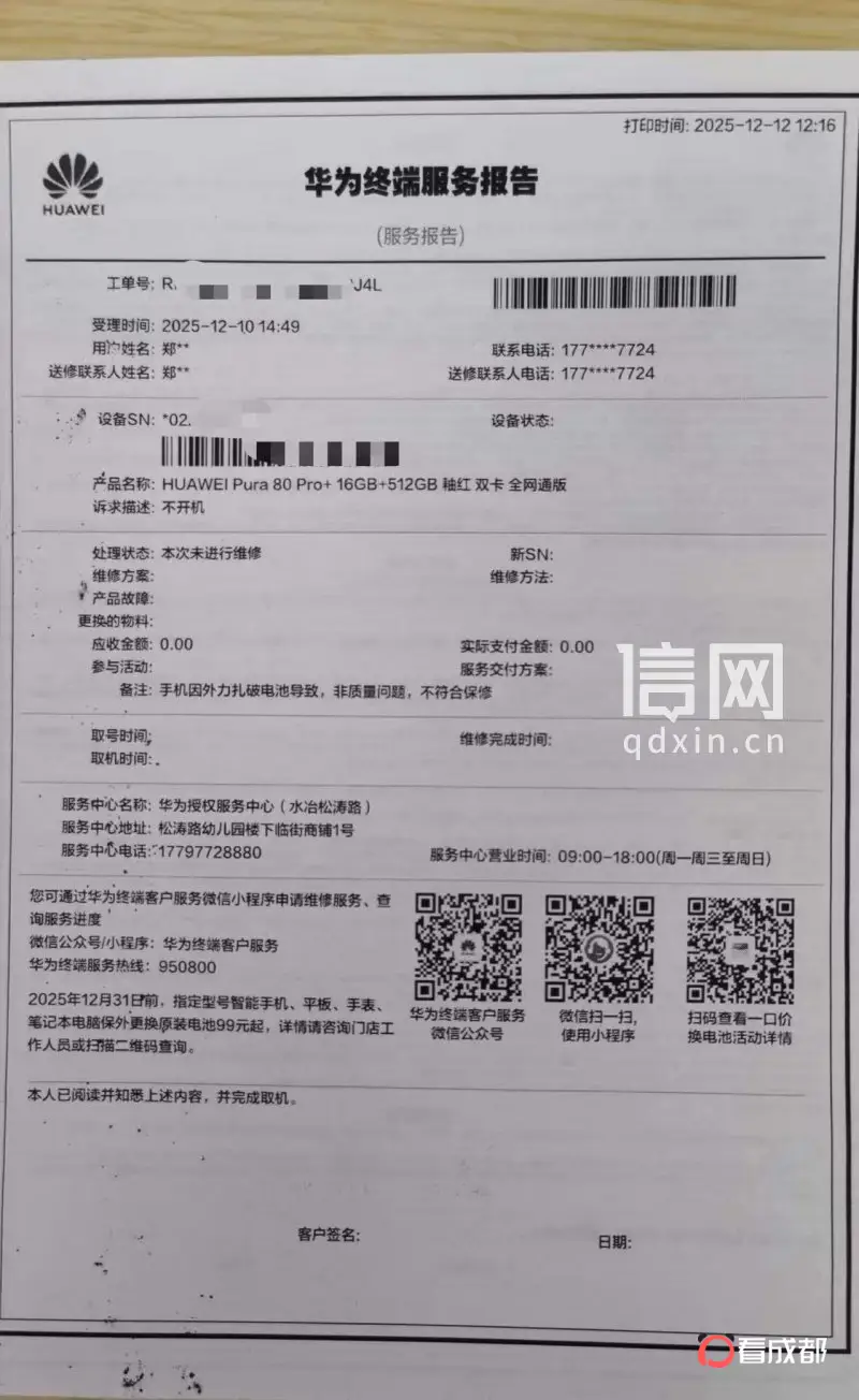 郑先生告诉信号新闻,他当场拒绝了华为售后提出的“需自行承担维修费用”的方案,坚持“全额退款或更换新机”的诉求,双方未能达成一致。