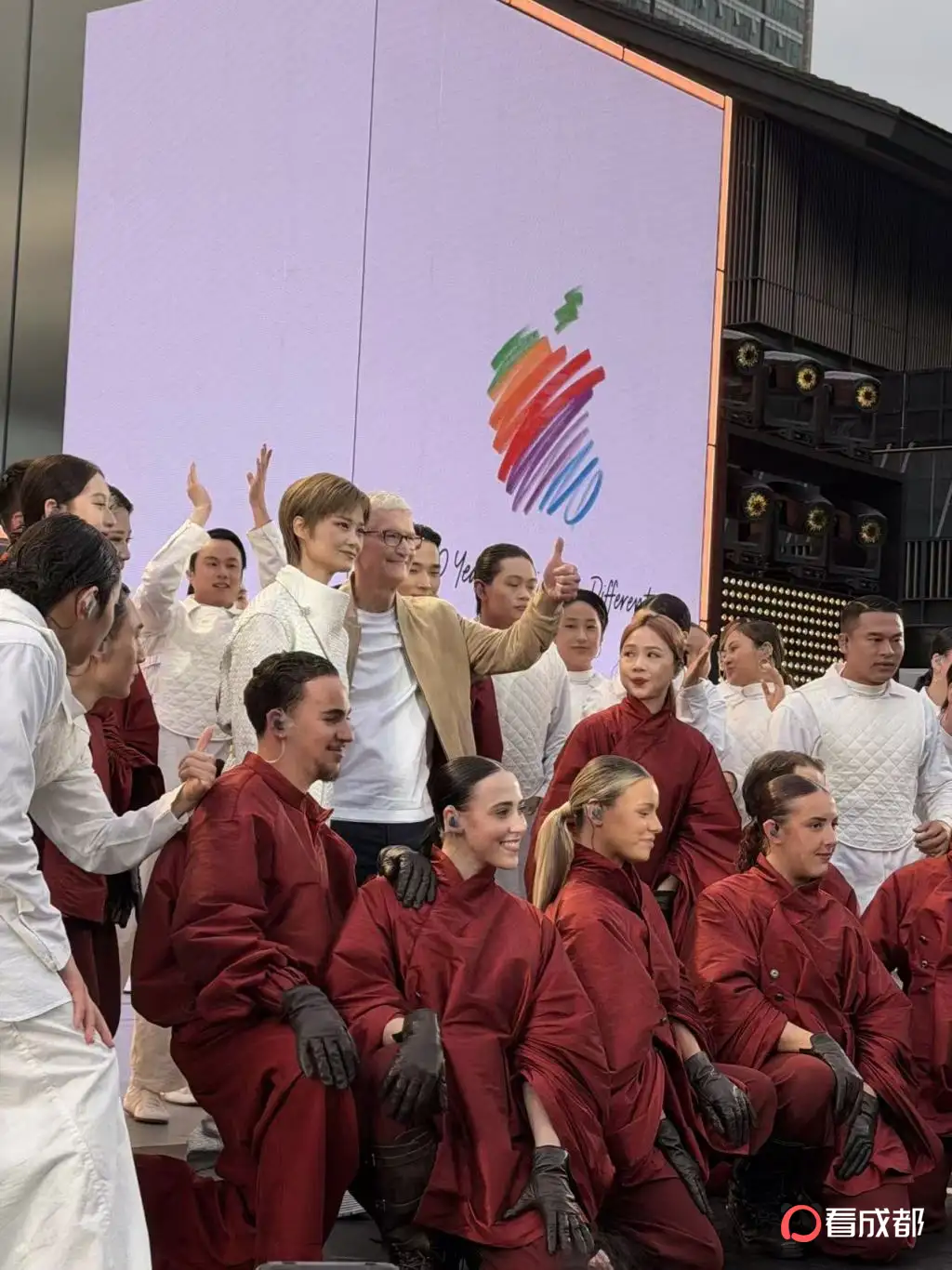 离庆典开始提前五分钟,苹果CEO库克出现在苹果成都太古里零售店舞台现场,与大家打了声招呼。下午三点,庆典正式开始,成都出生的知名歌手李宇春开始上台表演。