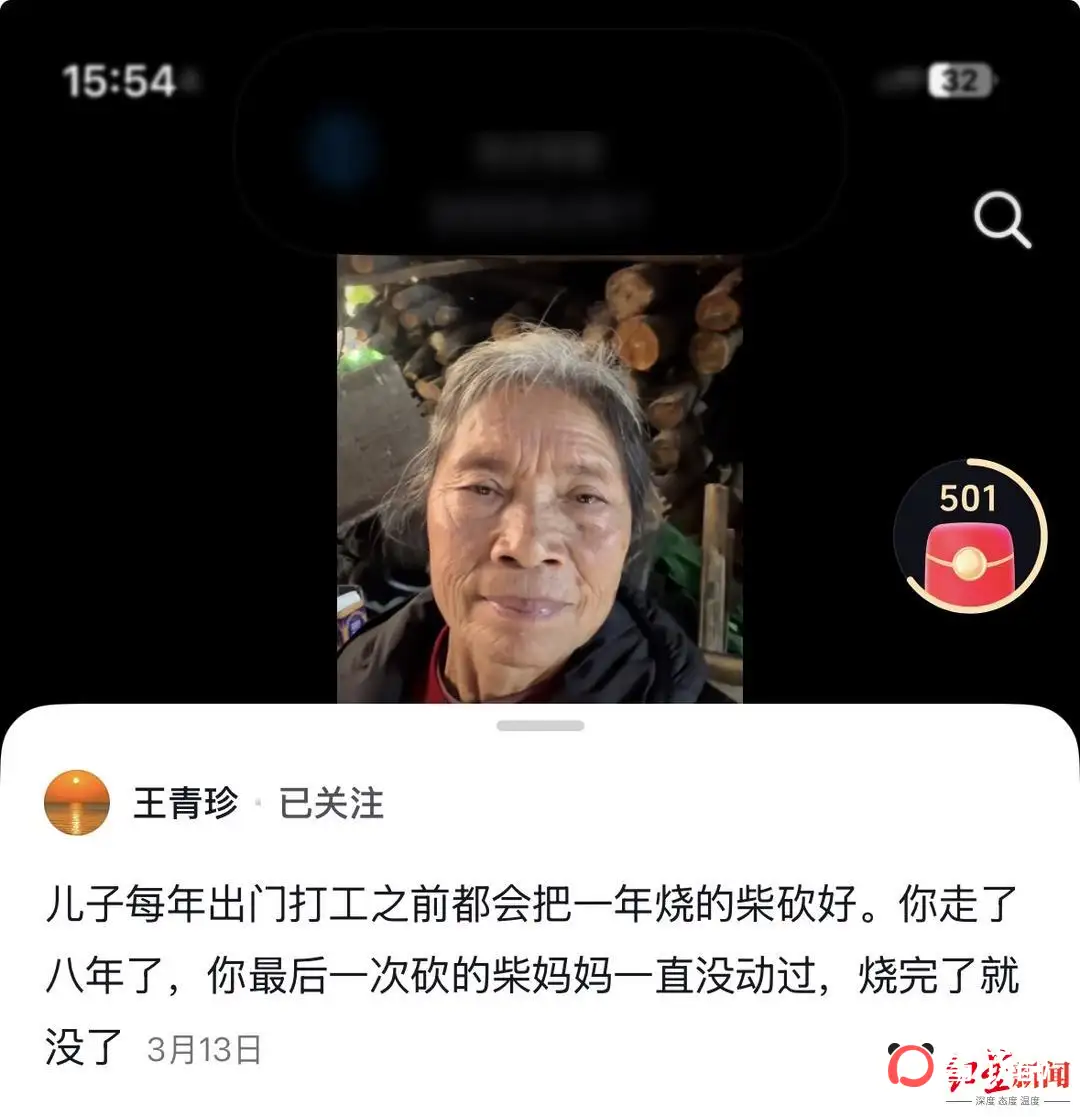 3月13日,王青珍的短视频账号发布了一段视频:镜头对准厨房隔壁猪圈里堆放整齐的木柴。配文写道:“儿子每年出门打工之前,都会把一年烧的柴砍好。你走了八年了,你最后一次砍的柴妈妈一直没动过,烧完了就没有了。”