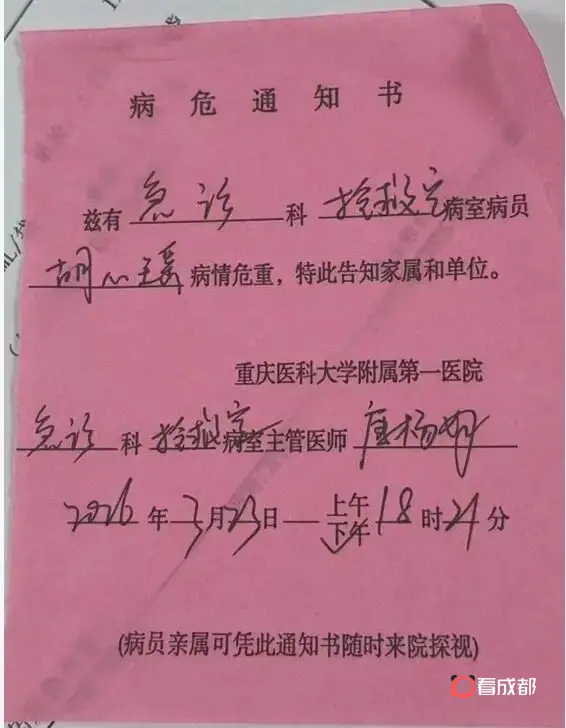 胡心瑶告诉记者,23日当天,她在医院又收到了一张病危通知书,今年已经收了十几张。年迈的父母都在老家,当过护士的她只能一个人照顾自己,病危通知书也是由自己收。